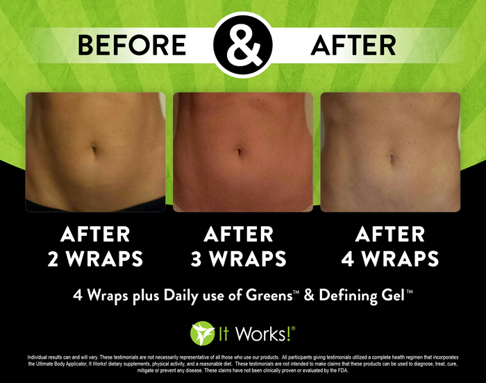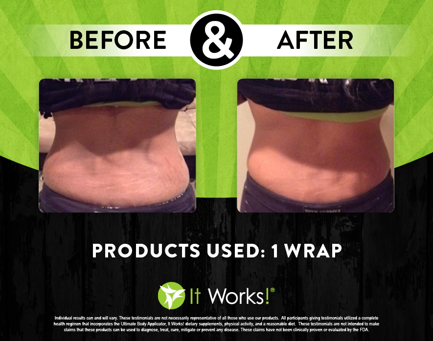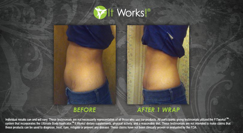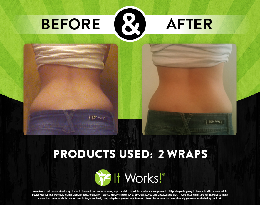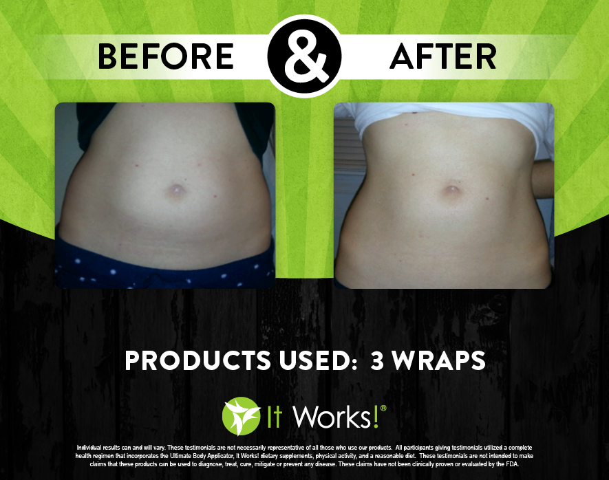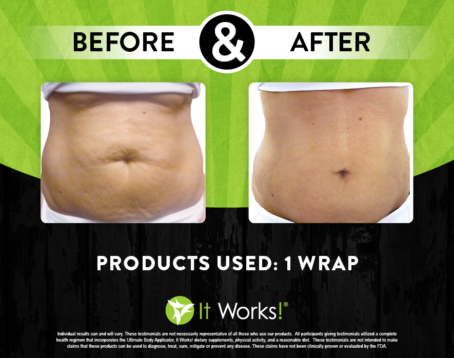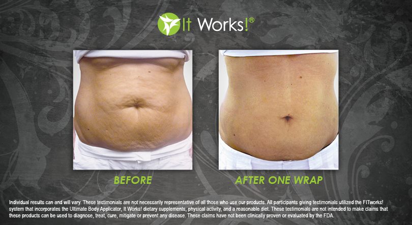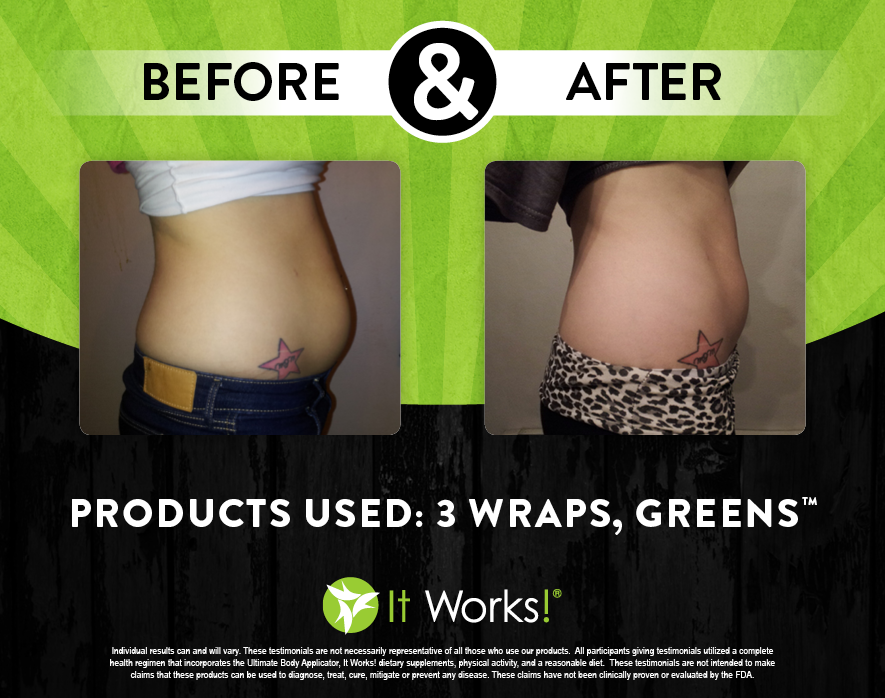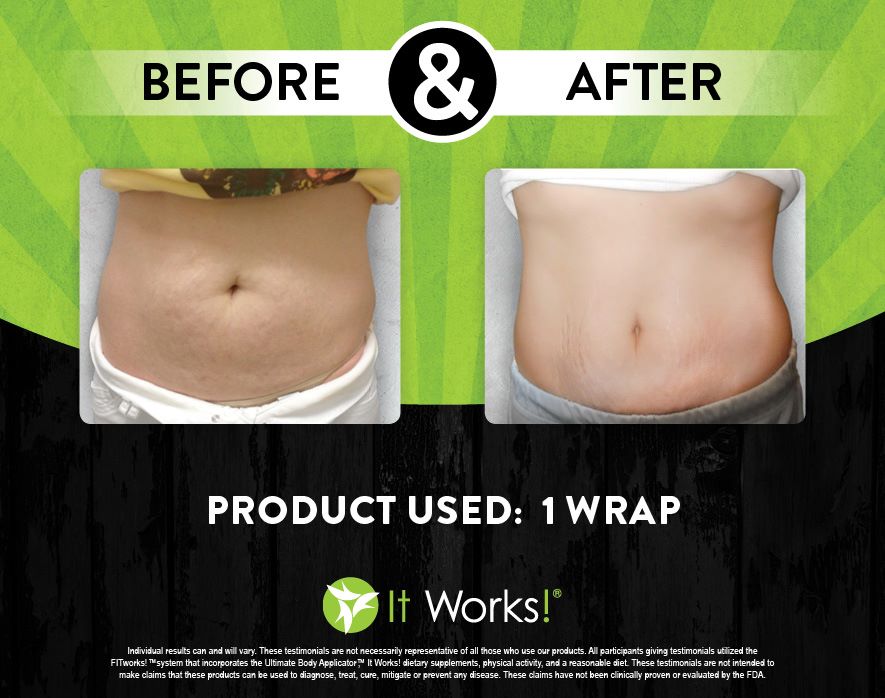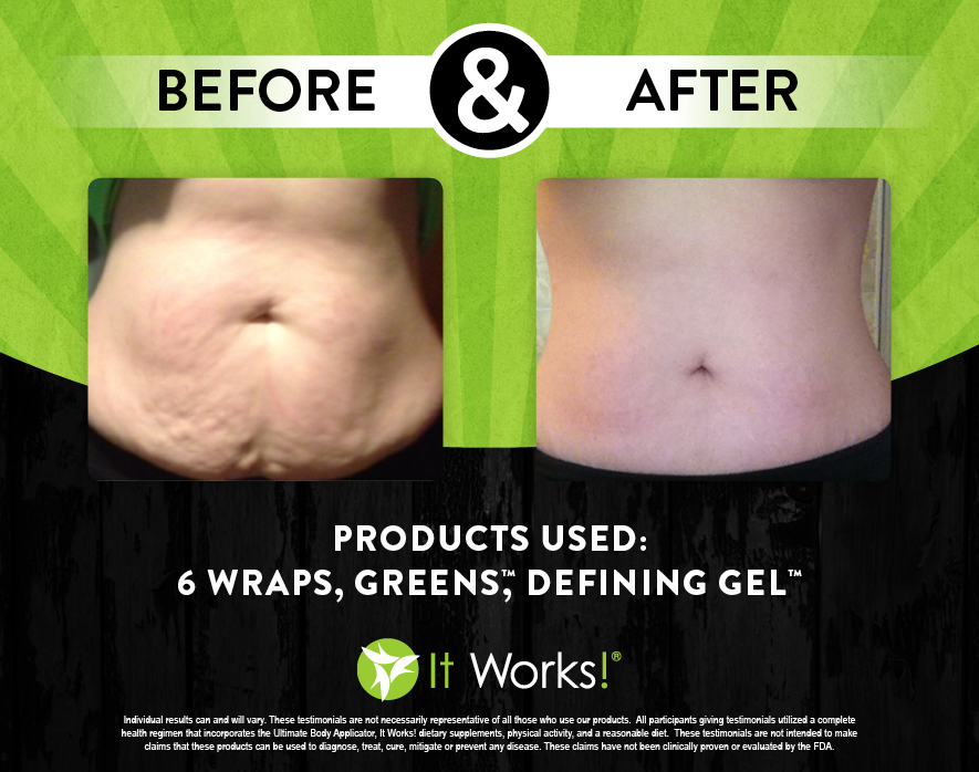 Individual results may vary. These Testimonials are not necessarily representative of all those who use our products. All participants giving testimonials utilized the It Works! Global System that incorporates the Ultimate Body Applicator, It Works! Global dietary supplements, physical activity, and reasonable diet. These testimonials are not intended to make any claims that these products can be used to diagnose, treat, cure, mitigate or prevent any disease. No claims have been proven or evaluated by the FDA.